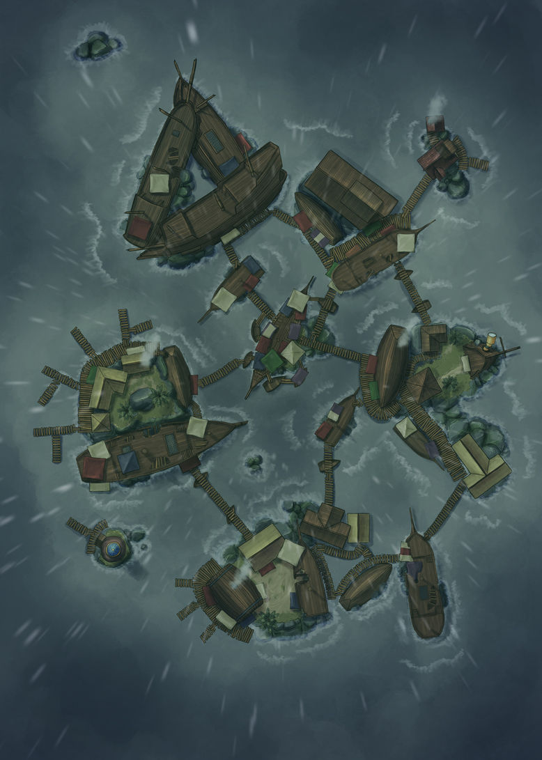 A floating port comprised of old hunks and shipwrecks.